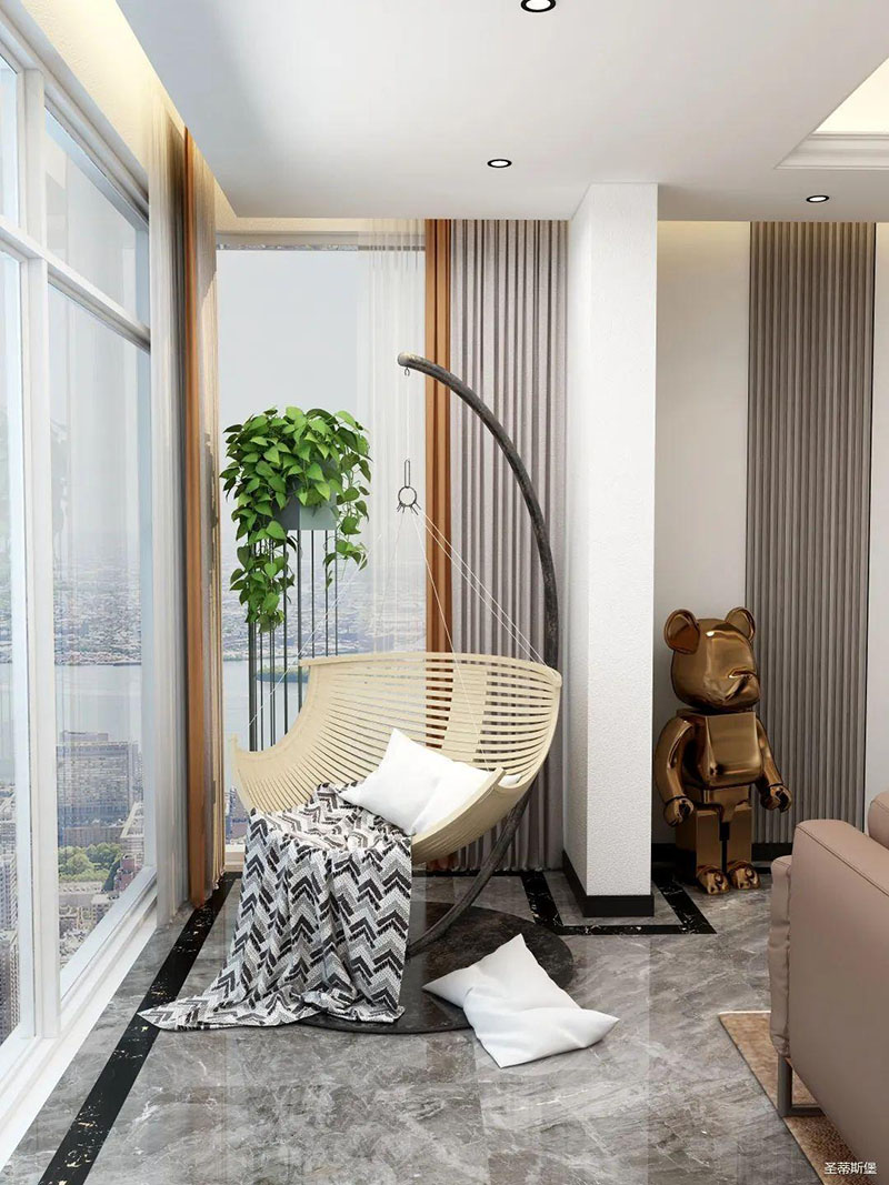 陽臺上大面積的落地窗,將頂層的位置優(yōu)勢完美展現(xiàn),視野與采光都得到了保證,站在窗邊就能俯瞰蒞臨江湖的城市美景。陽臺上留一隅悠閑的小角落,置入竹編狀的吊椅,閑暇時光都可以在這度過。