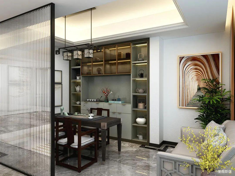 客廳與茶室之間以長虹玻璃隔斷,有效的劃分功能區(qū),為空間展現(xiàn)一番“猶抱琵琶半遮面”的東方意境美。茶室將意式極簡與傳統(tǒng)風格糅合,摒棄繁雜、刻板的形式,以含蓄的現(xiàn)代極簡詮釋著東方美學,展現(xiàn)著傳統(tǒng)的待客之道。實木與鎢金金屬質(zhì)感碰撞,有棱有角,高級感頃刻得到了升華。