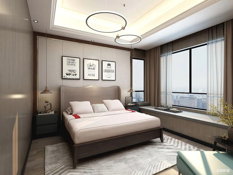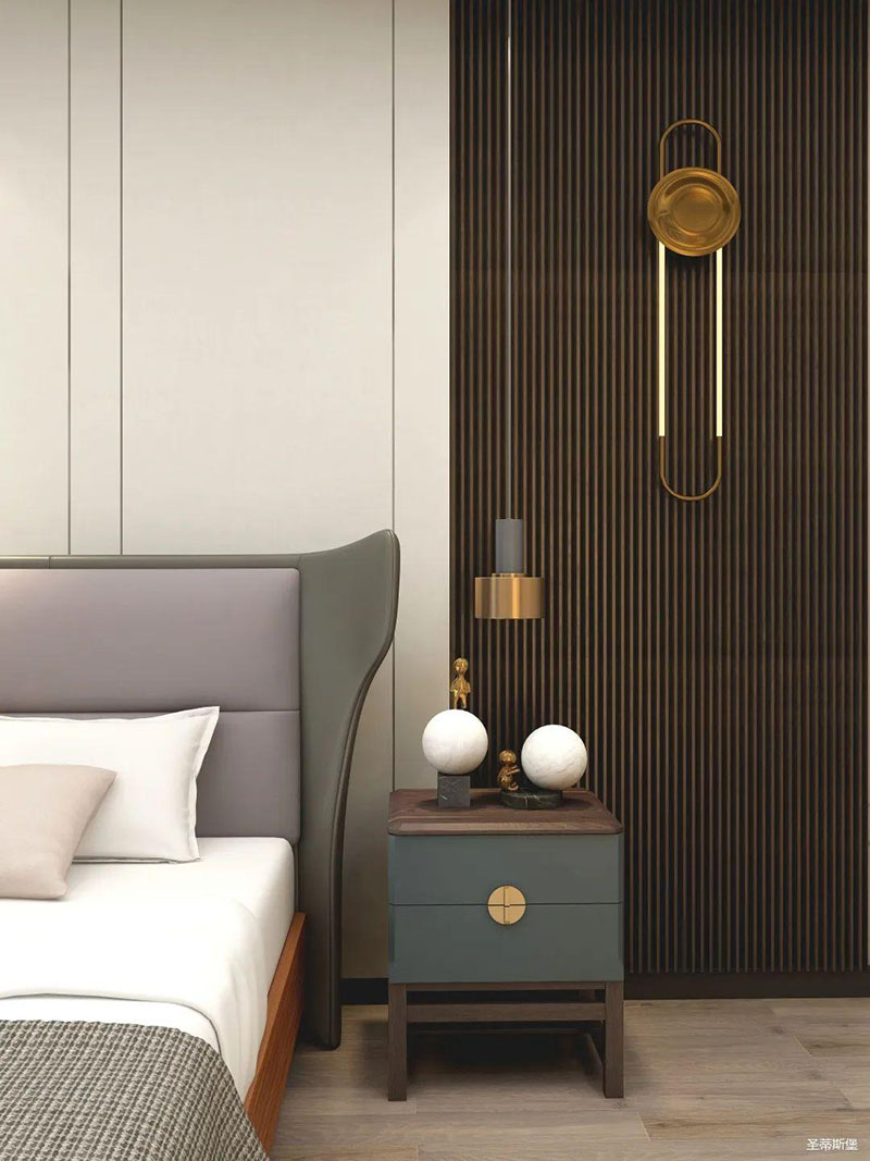 臥室精簡有致,從質(zhì)感出發(fā),打造由內(nèi)而外的優(yōu)雅奢華感。背景墻、地板、地毯均擁有較強的肌理感,在加上金屬軟裝飾物調(diào)和,讓空間在低調(diào)內(nèi)斂的基礎上又不失時尚的高級感,飄窗進階為溫馨的一角,閑暇時,則可倚窗而坐,品一杯紅酒,感受生活中的愜意時光。