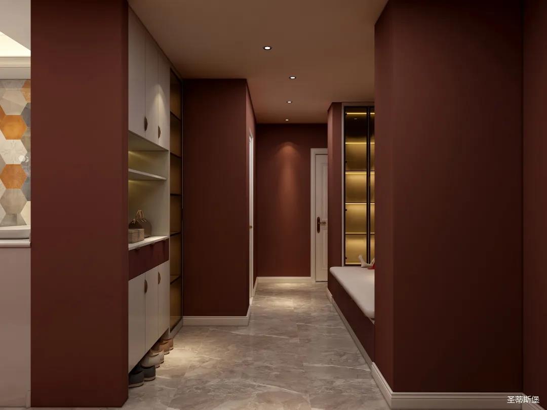 表姐不喜歡大白墻設計,于是設計師完美貼合表姐的喜好,摒棄了傳統的大白墻,將色彩跳躍的鐵銹紅應用于空間,從視覺上豐富了空間的層次感。南北通透的空間布局,讓視野更為清透明亮。