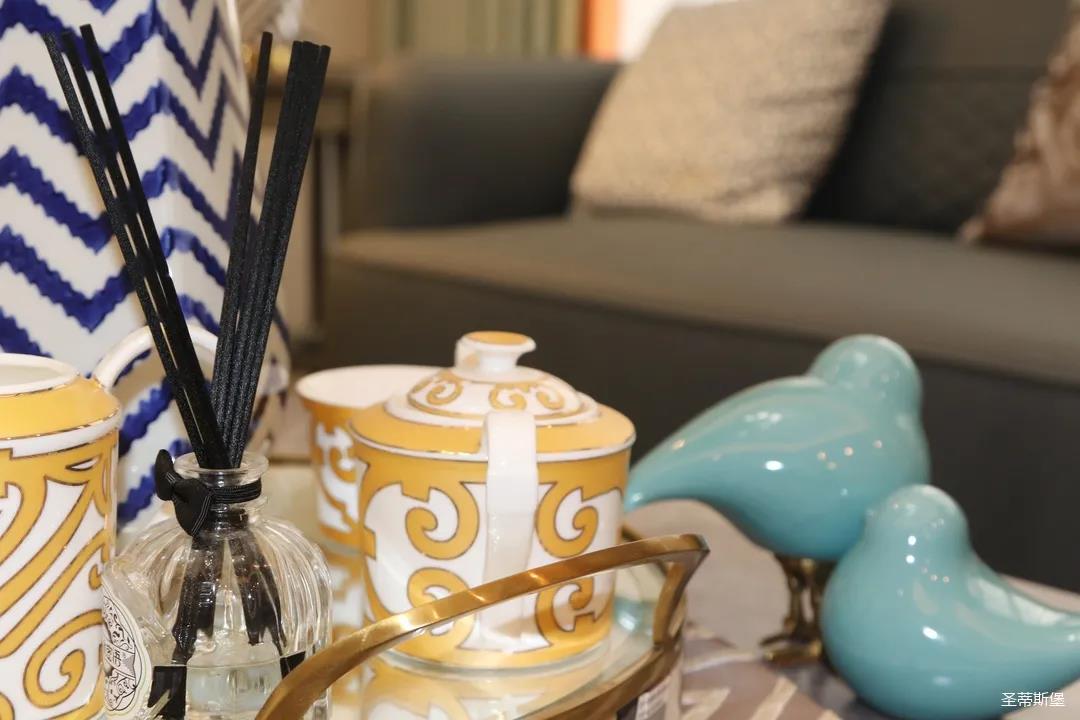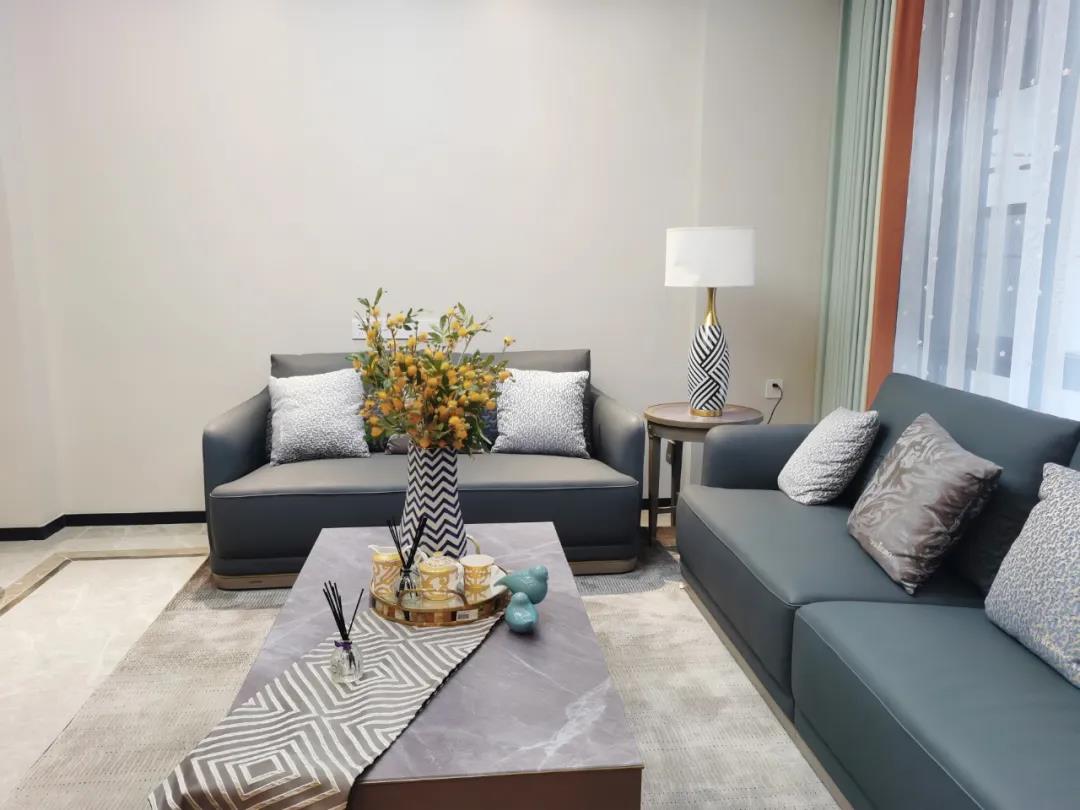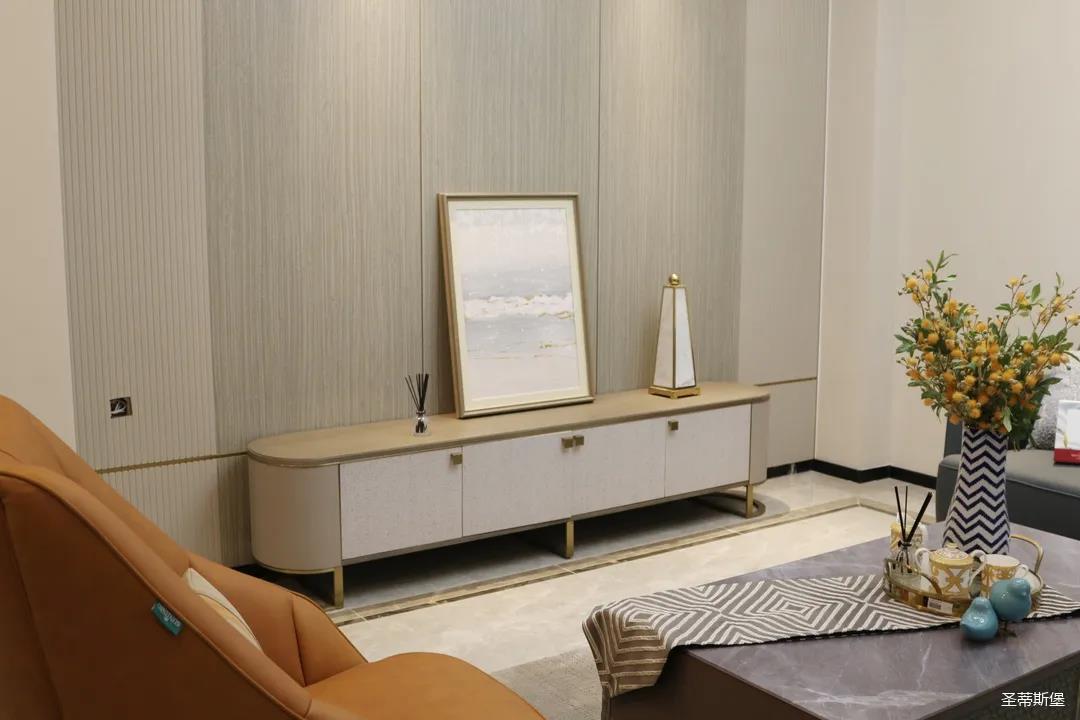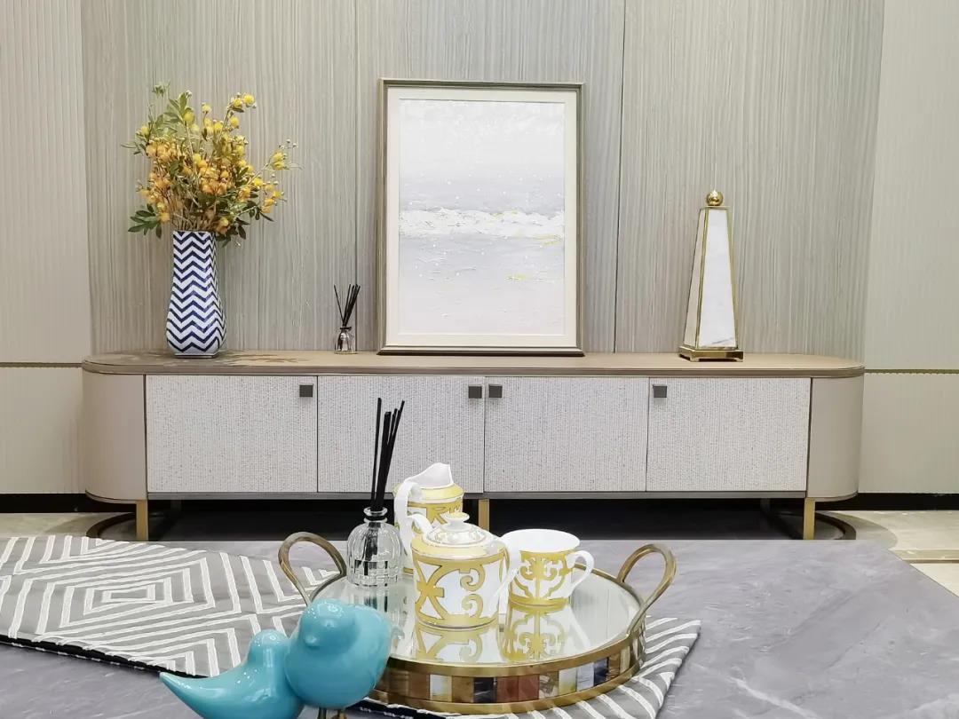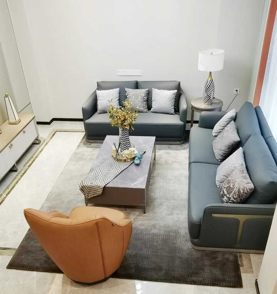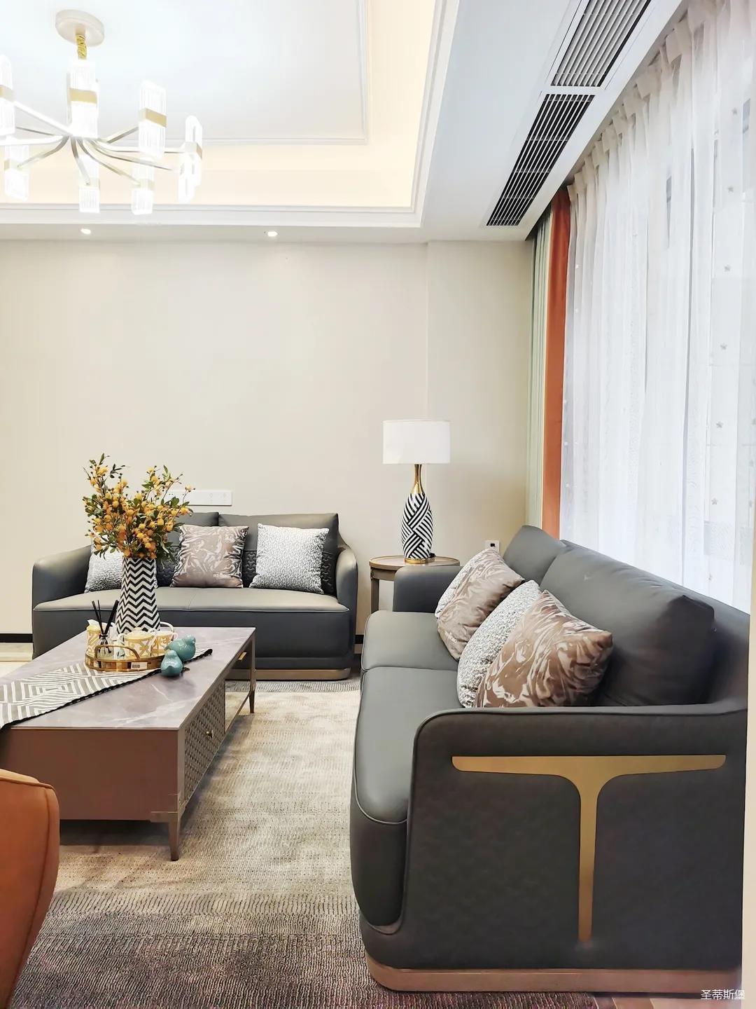 淺灰為基底的飾面與低飽和度的深色沙發相互映襯,產生強烈的視覺沖擊,深色的家具讓空間從視覺上衍生出一種縱深感。巖玻的質感與真皮編織的紋理盡顯現代之美,細節陶瓷擺件注滿了空間優雅的藝術氛圍。