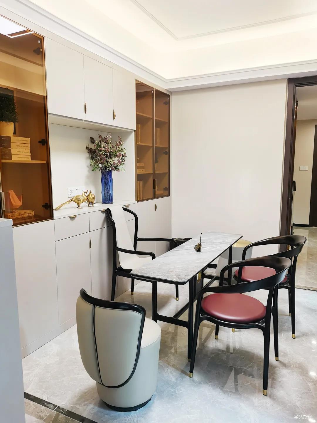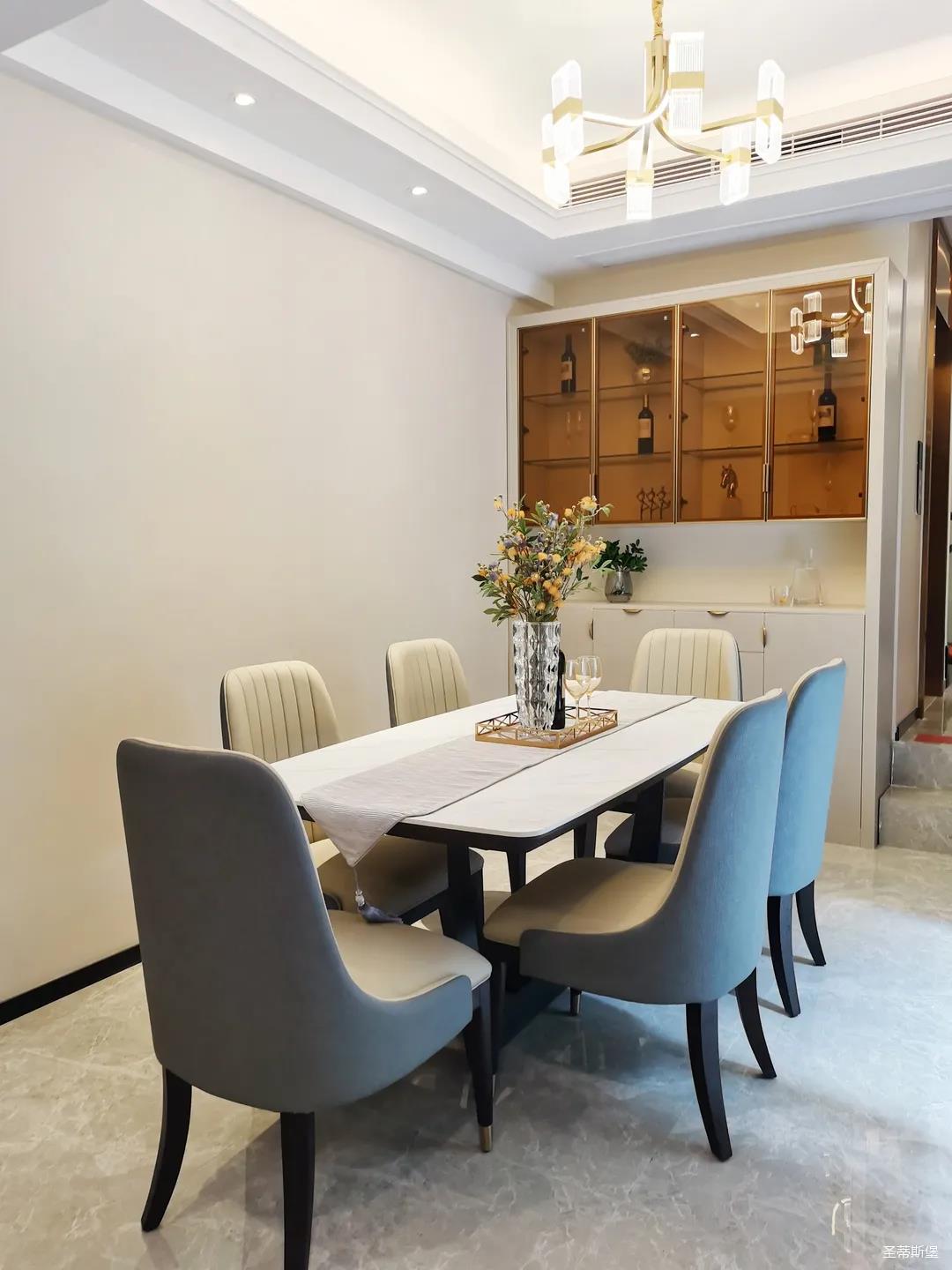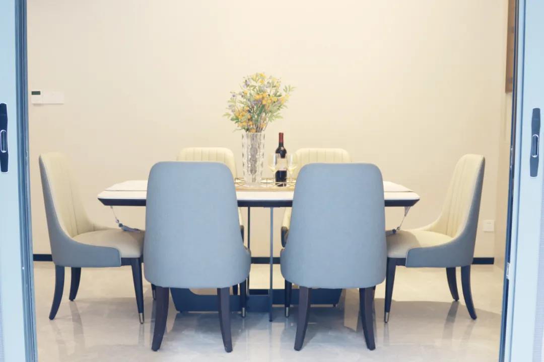 客餐廳雖屬同層,但由廊道隔開,各有寬闊的空間格局,加上引入自然光源的采光設計,空間通透明亮。巖板餐桌搭配的真皮餐椅,讓不同的材質在在空間完美契合,既增加了空間的時尚氛圍,也能給人良好的用餐體驗。