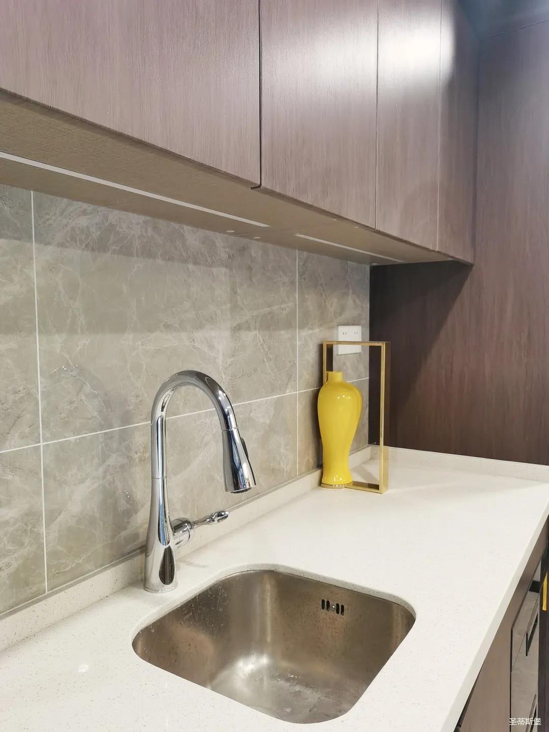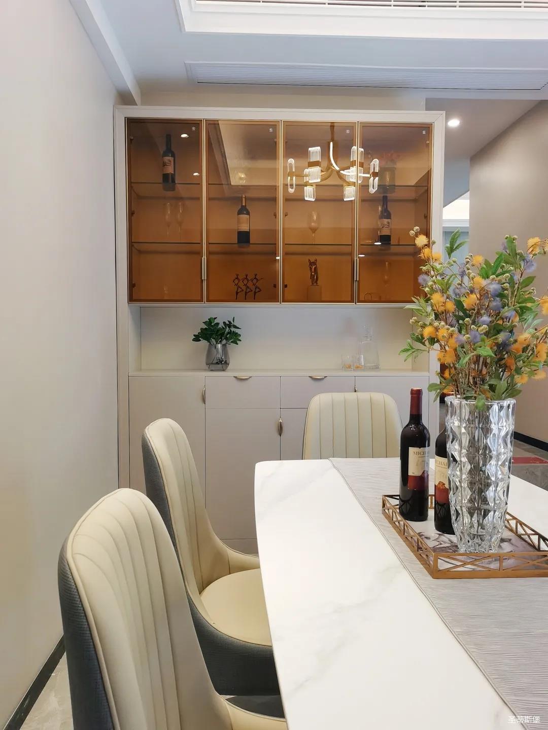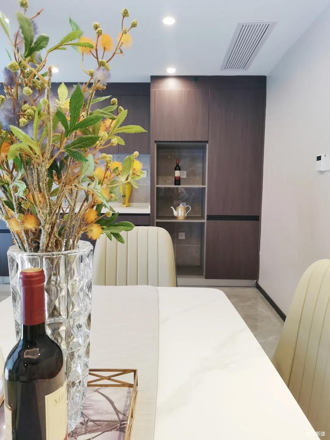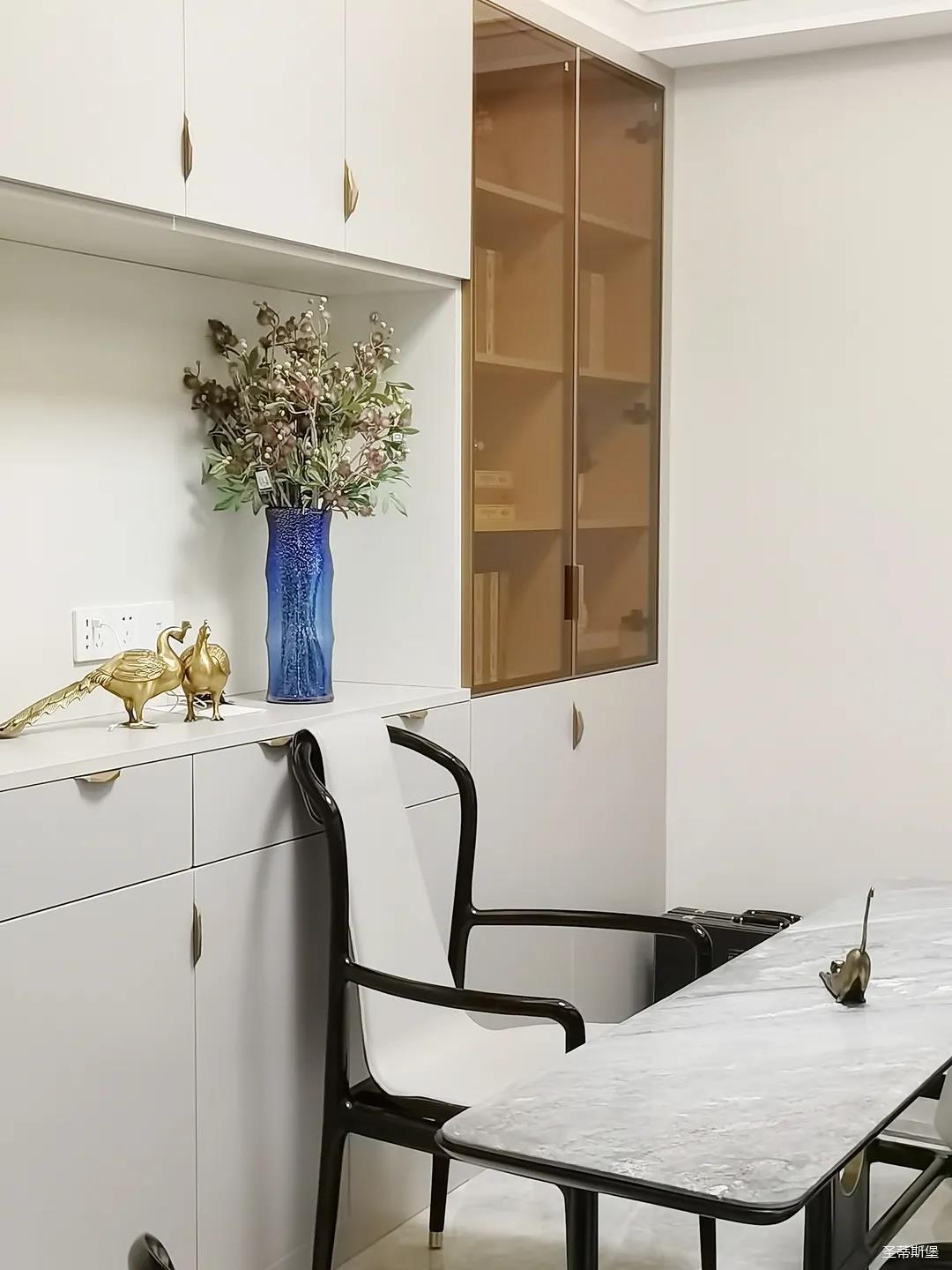開放式的餐廚設計讓餐邊柜和櫥柜的居家動線更為流暢,成了最便利的收納場所,生活小資而又美好。