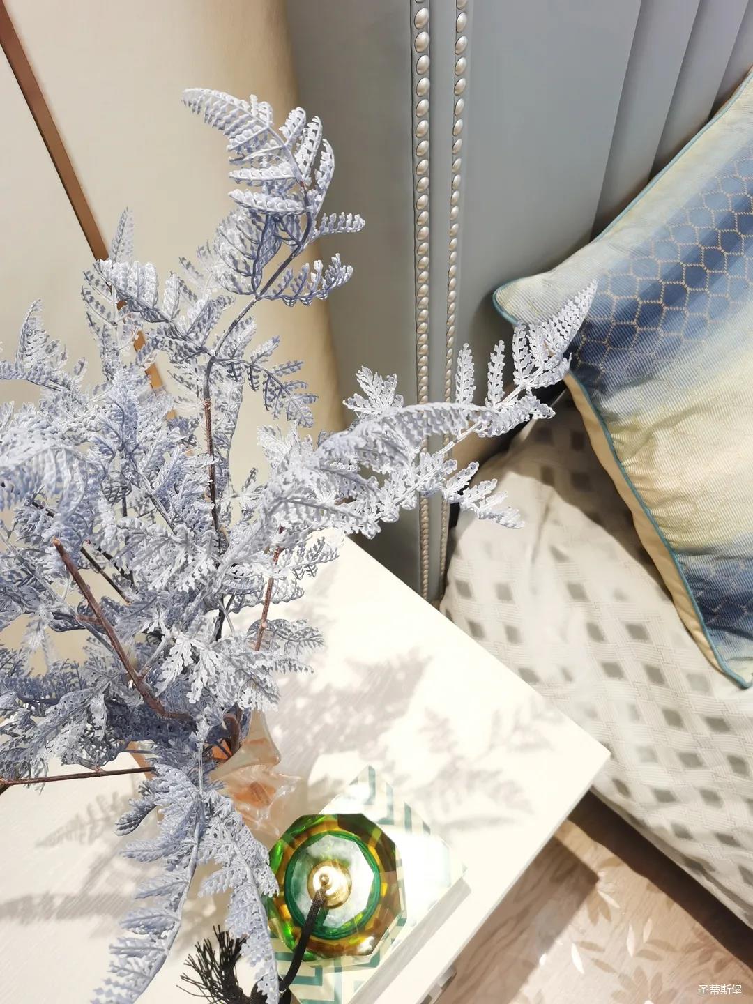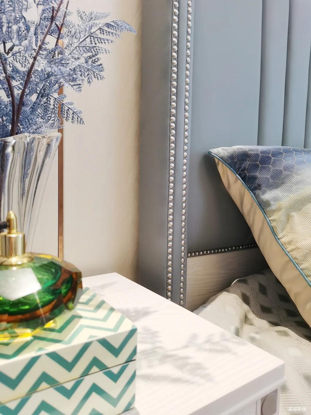 一樓的房間業主是作為長輩房,采用輕奢的背景墻面,結合亮眼的金屬線條設計,空間顯得時尚又不失沉穩。莫蘭迪色的淺藍床屏,在無主燈設計與自然光線的碰撞下醞釀出不同的光影美感。