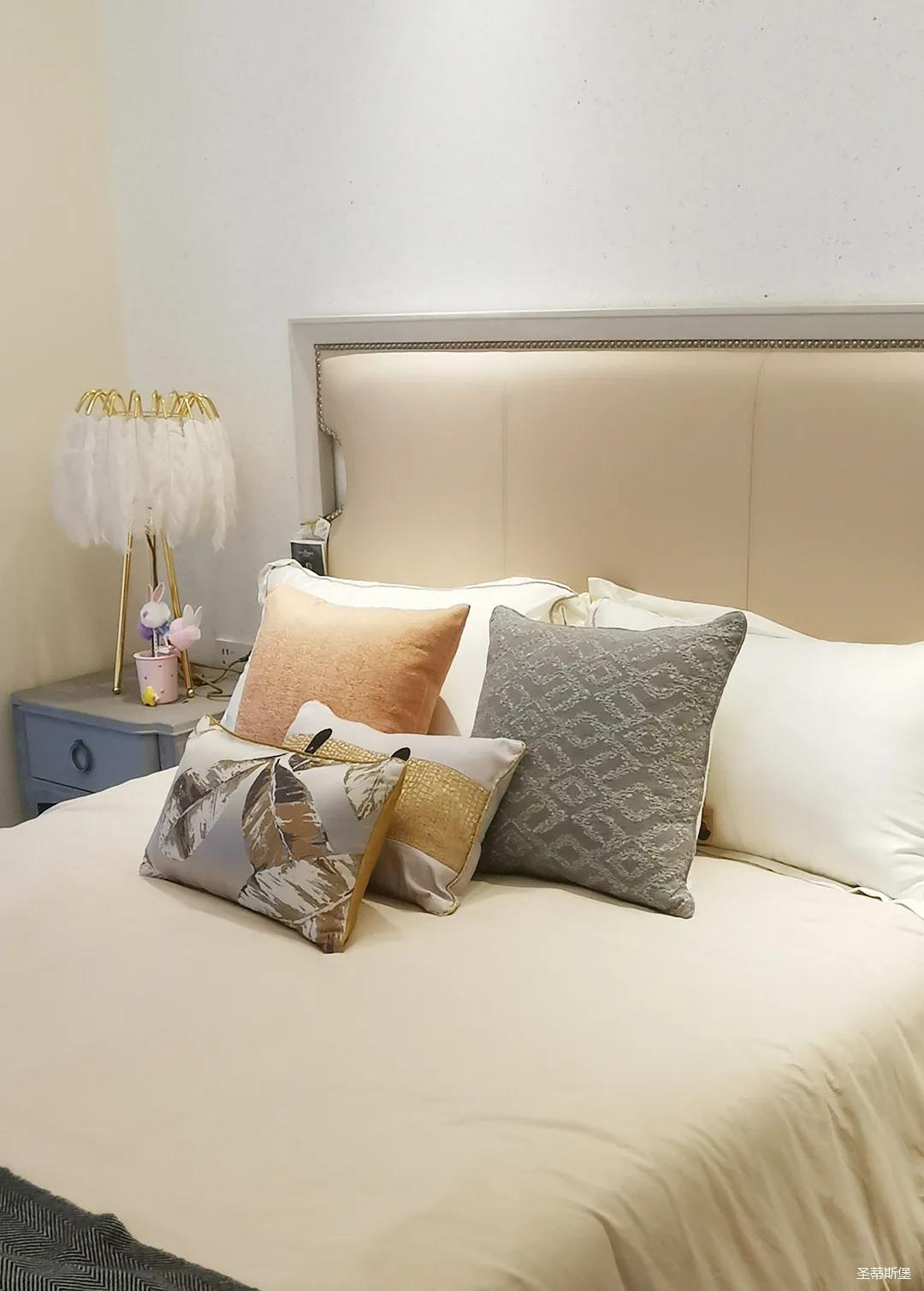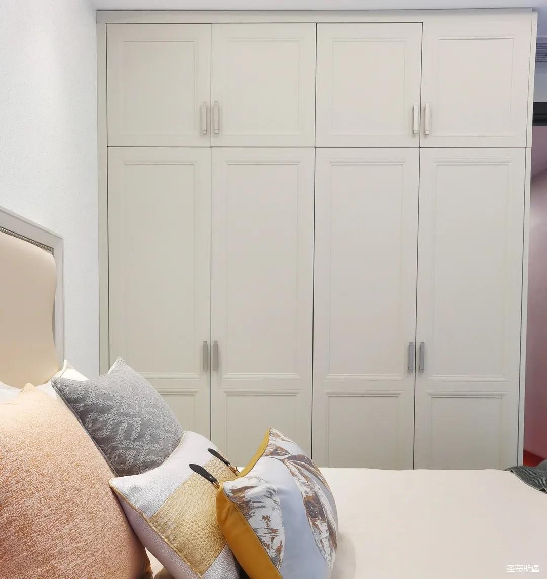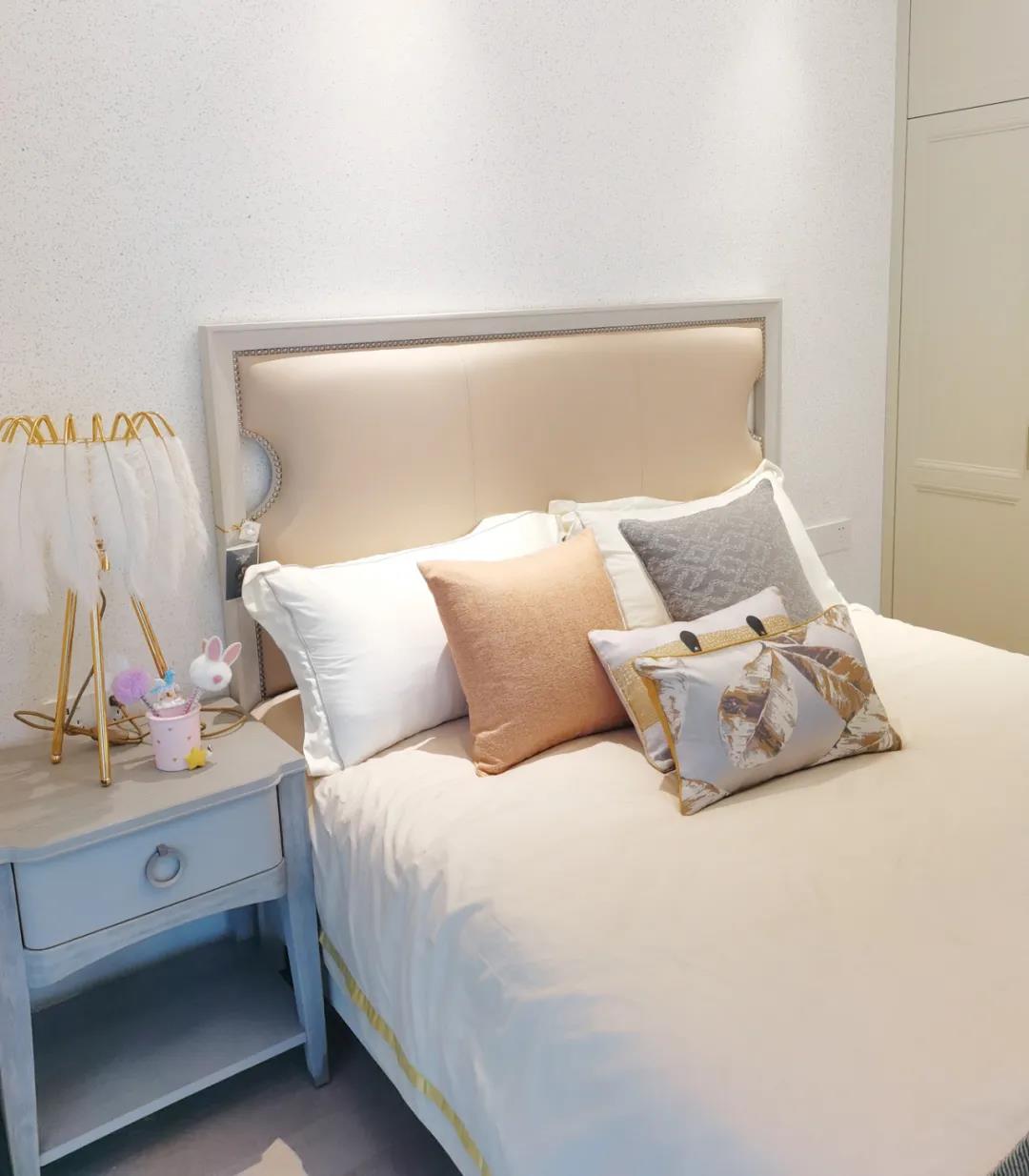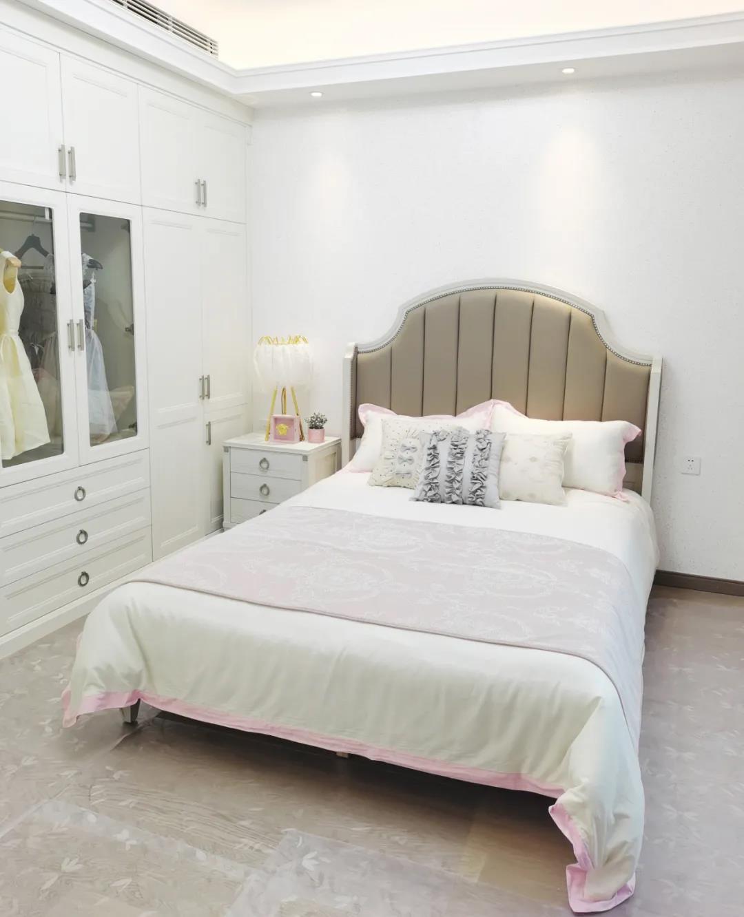 少女粉軟包床屏搭配仙氣十足的羽翼臺燈,讓空間顯得尤為夢幻。功能與顏值兼具的定制衣柜,與溫柔的空間相得益彰,簡單優雅的同時也不失童趣。