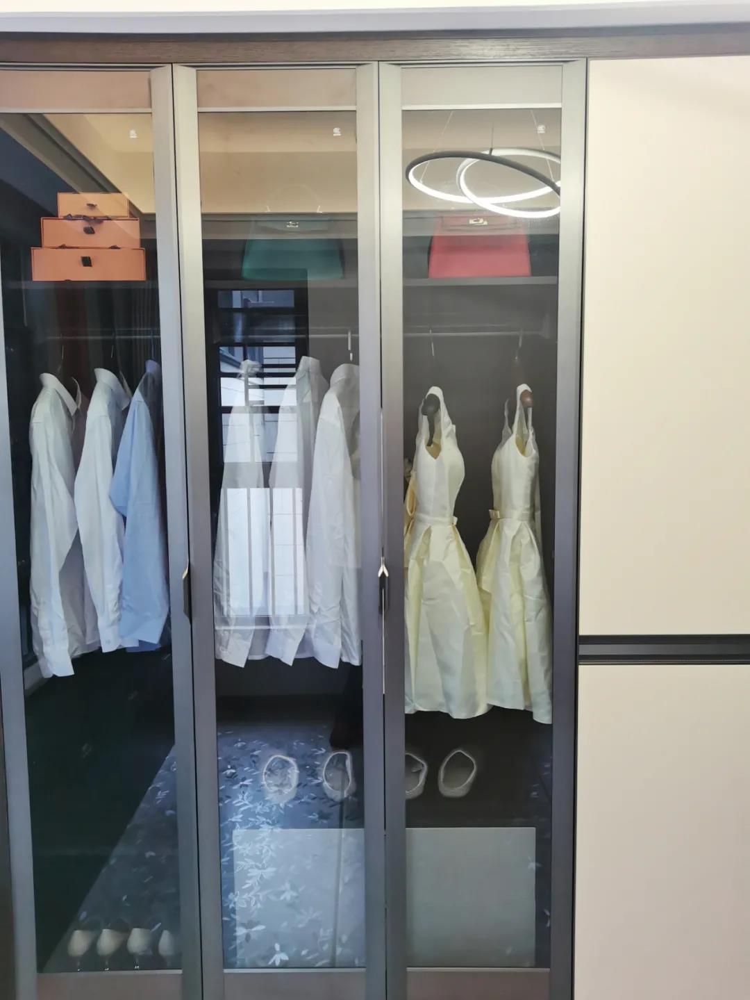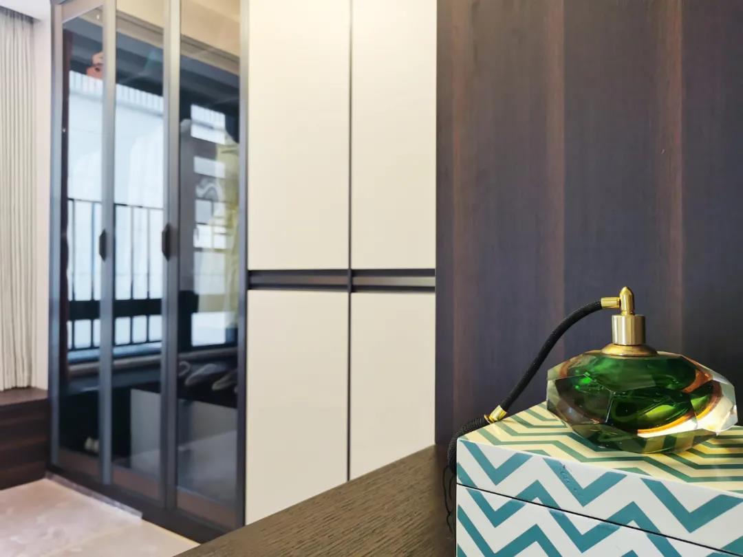 衣帽間以現代極簡設計手法引入輕奢元素,借助實木與金屬組合打破了傳統儲物區的沉悶感,煙熏色橡木紋的定制柜體,色澤好似一杯溫暖醇香的摩卡,令空間層次感與立體感的格調頓生,予以沉穩舒適感官體驗。