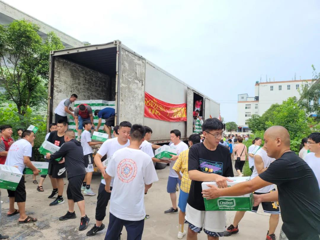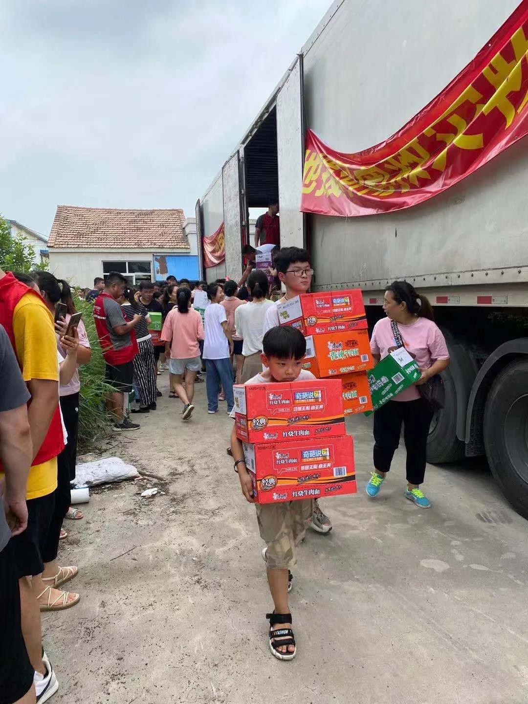 一輛滿載純凈水和食品等抗洪救災(zāi)物資的卡車,