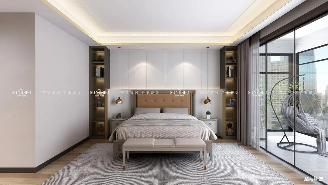 床屏上的金屬元素與軟裝飾品相互呼應,盡顯精致優雅的美學內核,對稱式的定制柜體,循著實用的痕跡,展現了空間的對稱美感。