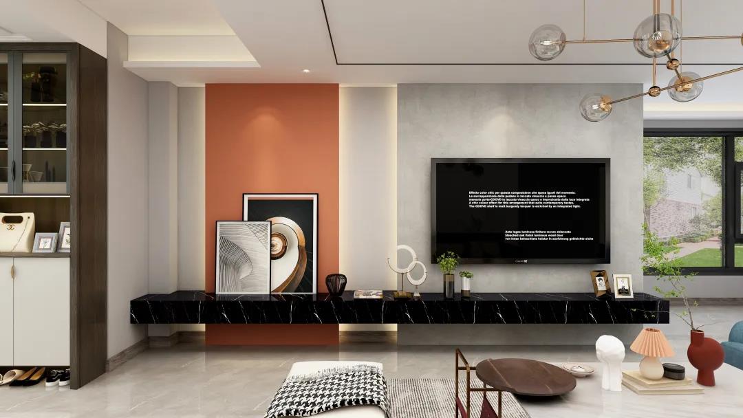 窗外的陽光使得客廳空間更加明亮寬敞。電視墻精致的線條設計,令空間更具層次感。亮眼的愛馬仕橙,搭配個性的抽象掛畫又讓整個墻面更加豐富。活力與沉穩融合,給平凡而枯燥的生活增添些許希望與美好。