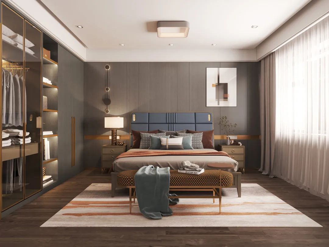 優雅沉靜的霧霾藍床架,干凈利索的線條設計,天然的皮革紋路,與原木色的墻面相呼應,純粹、樸實,營造出輕奢簡約的氛圍,滿足了屋主對空間的無限暢想。